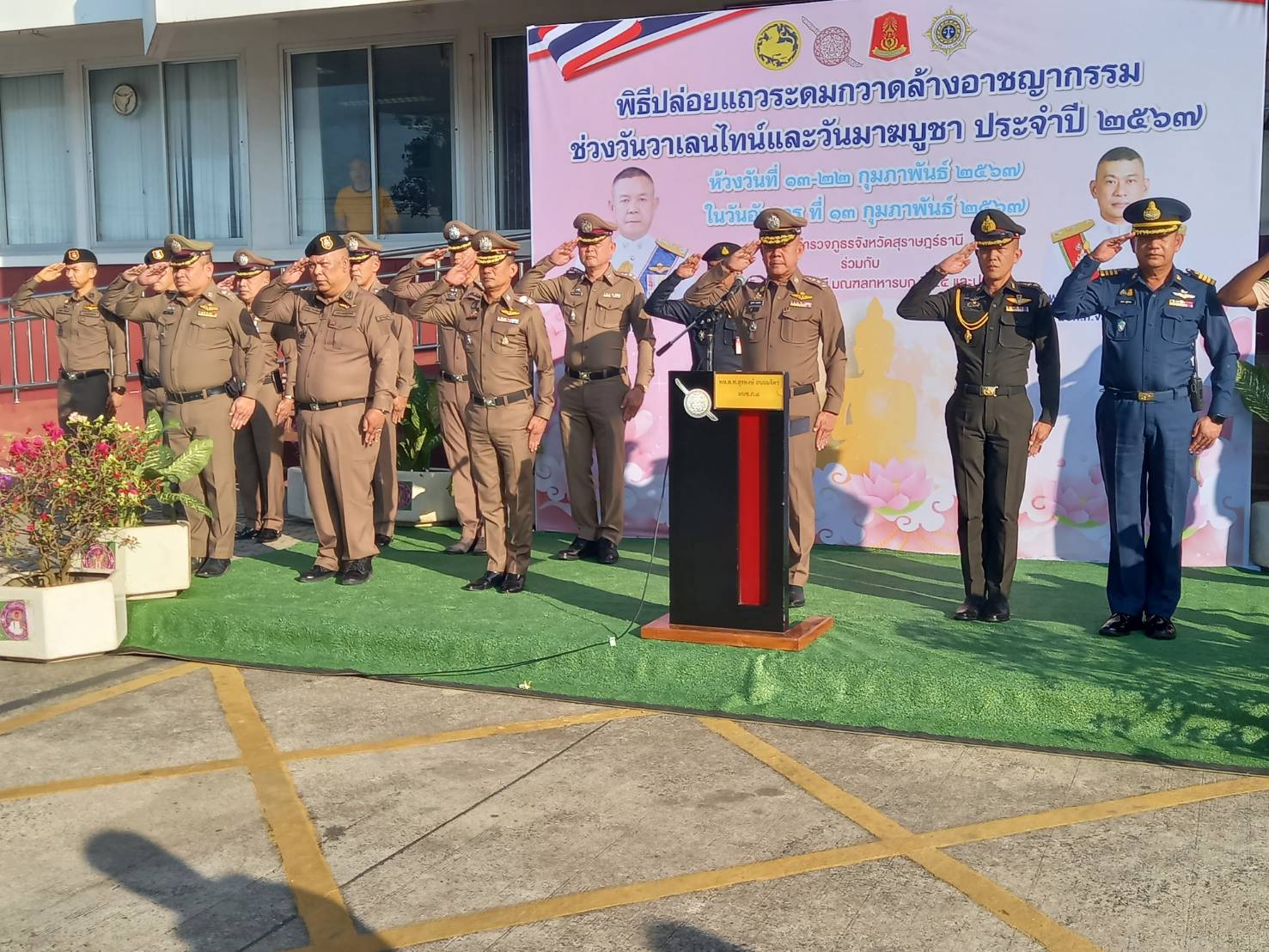 พ.ต.อ.ยุทธนา ศิริสมบัติผกก.สภ.บ้านนาสาร ร่วมปล่อยแถวระดมกวาดล้างอาชญากรรม ช่วงวันวาเวนไทน์และวันมาฆบูชา ประจำปี 2567 ห้วงวันที่ 13 – 22 ก.พ.2567 ณ สภ.เมืองสุราษฎร์ธานี