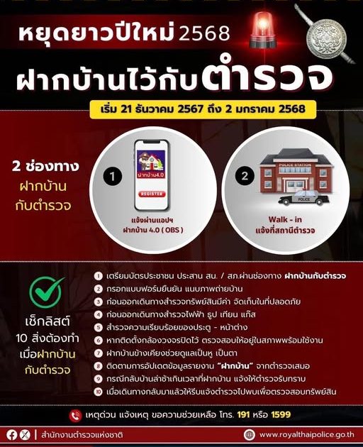 สภ.บ้านนาสาร รับฝากบ้านช่วงเทศกาลปีใหม่ 2568 เริ่ม 21 ธันวาคม 2567-2 มกราคม 2568 ติดต่อประสานได้ทางโทรศัพท์ 077341782 หรือฝากผ่าน app police4.0