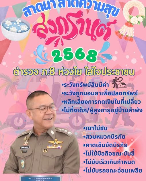 พล.ต.ท.สุรพงษ์ ถนอมจิตร ผบช.ภ.8 ได้มีความห่วงใยพี่น้องประชาชนที่จะเดินทางกลับภูมิลำเนาหรือท่องเที่ยวตามสถานที่ต่างๆ ในช่วงเทศกาลสงกรานต์ โดยเฉพาะเรื่องของความปลอดภัยและความสะดวกในการจราจร ตลอดจนความปลอดภัยในชีวิตและทรัพย์สินของพี่น้องประชาชนจากอาชญากรรมรูปแบบต่างๆ ทั้งนี้ขอให้ท่านและครอบครัวเดินทางปลอดภัย และปฏิบัติตามกฎจราจรอย่างเคร่งครัด